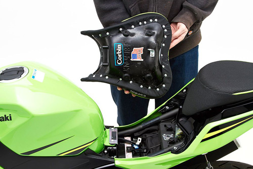 Due to the limited space and lack of sufficient structure, we were unable to incorporate the Corbin passenger backrest system into this seat model. Besides, on bike models like this Ninja, a backrest is of limited use due to the aggressive seating posture.