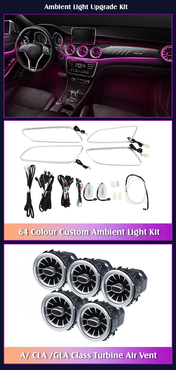 DMP Interior Ambient Lighting Kit for Mercedes-Benz A/CLA/GLA Class W176 X156 W117. The DMP Lighting Kit allows you to decorate car's interior according to your mood or personal preferences. The 64 colors of the ambient lighting create fascinating color worlds that alternate dynamically or illuminate several areas with different colors.